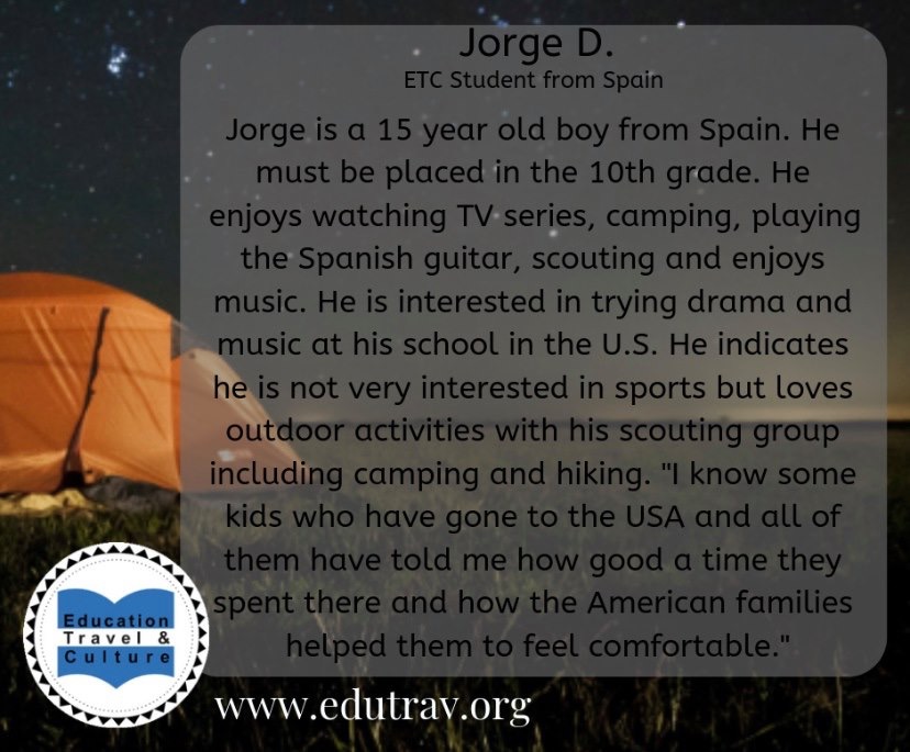 I have a student, Jorge, from Spain, who happens to be a Scout! We are still trying to find him a wonderful home for the upcoming school year. In Eugene we still have space at Churchill and North Eugene High schools!